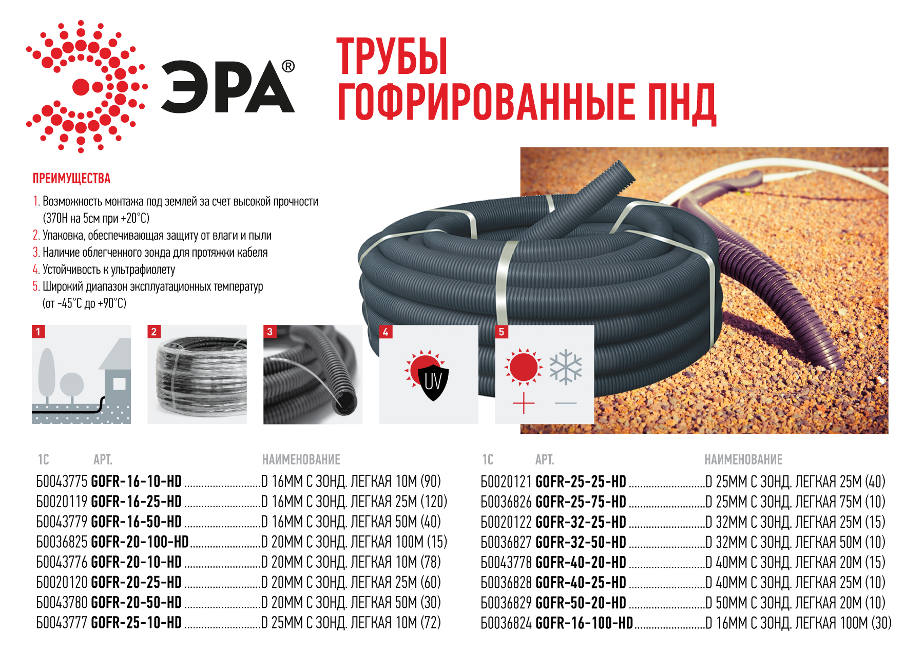 Труба гофрированная ПНД (черный) d 20мм с зонд. легкая 25м (60), производитель: ЭРА — купить с доставкой