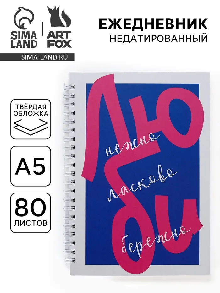 Ежедневник А5, 80 листов в твердой обложке на гребне «Люби» — Характеристики