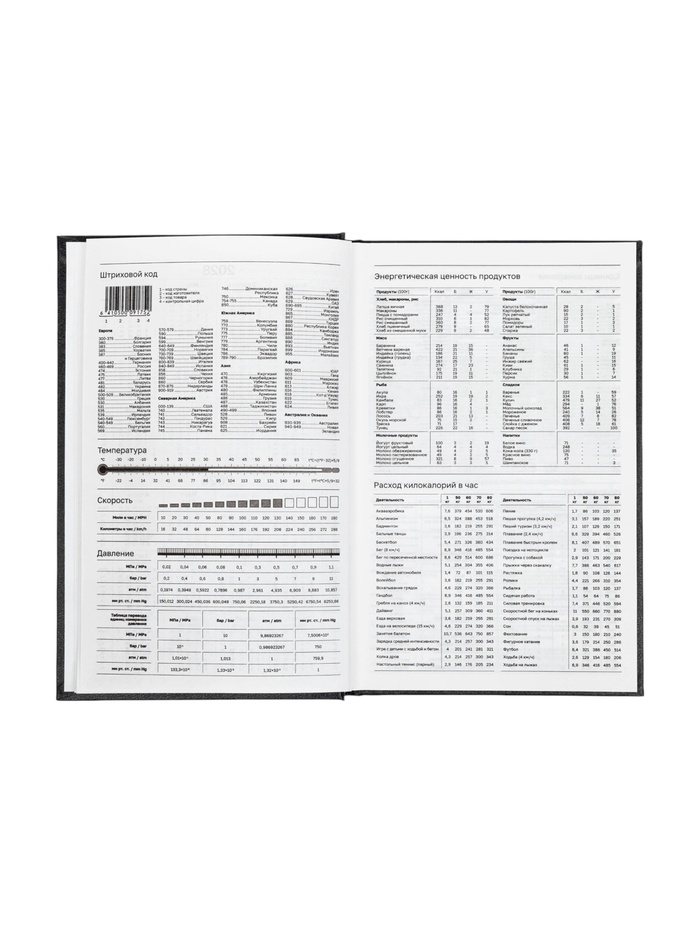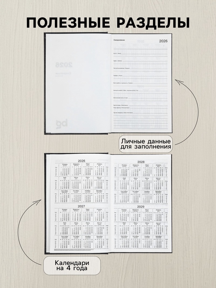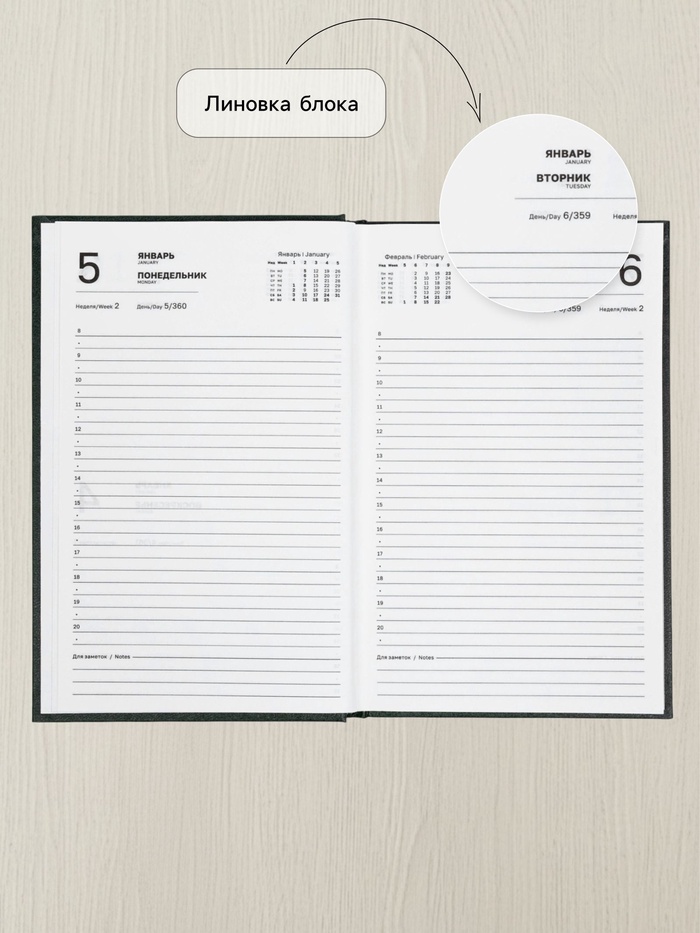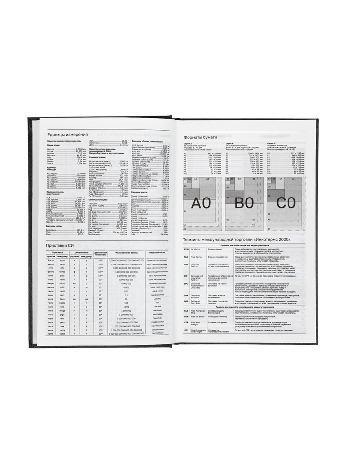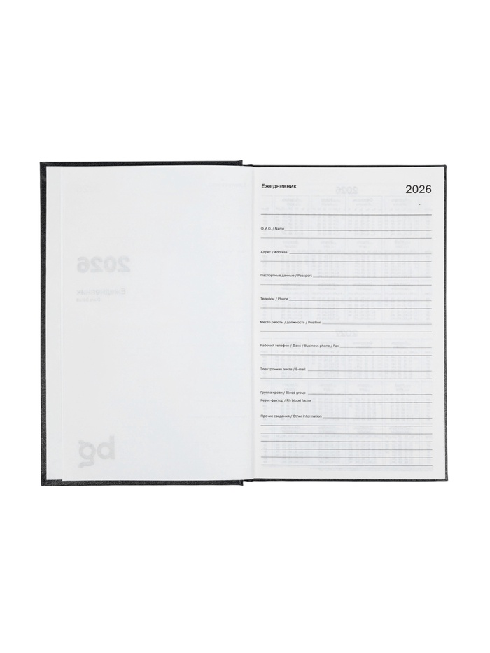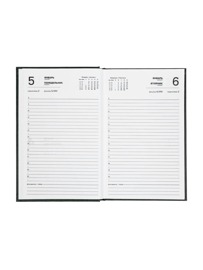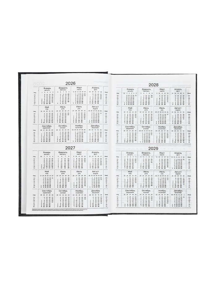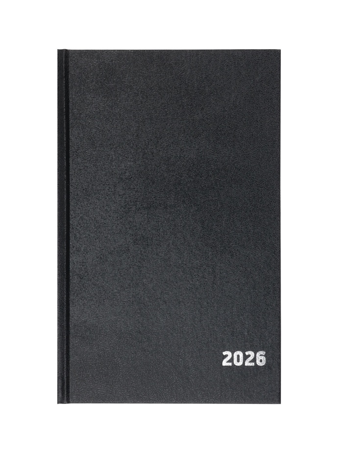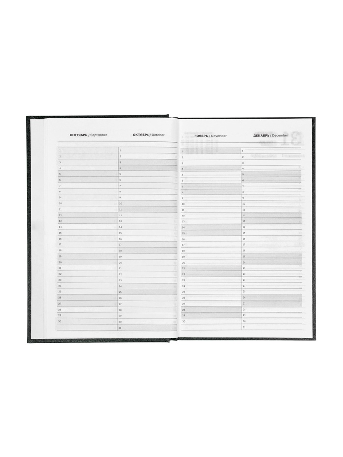 - Твёрдая обложка из бумвинила чёрного цвета сохраняет презентабельный вид в течение всего года.