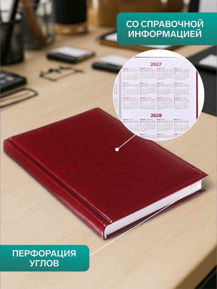 Этот бордовый ежедневник помогает вести записи в собственном ритме. Глубокий цвет обложки из искусственной кожи создаёт настроение сосредоточенности, а отсутствие дат даёт свободу начать планирование с любого дня.