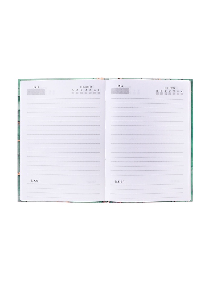 Этот ежедневник с мраморным градиентом создаёт вдохновляющее пространство для записей. Переливы зелёного на матовой обложке рождают ощущение свежести, а отсутствие дат даёт свободу начать вести записи в любой момент.