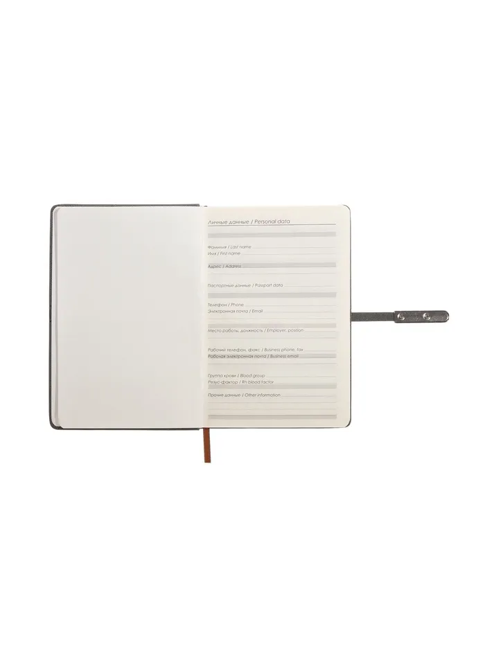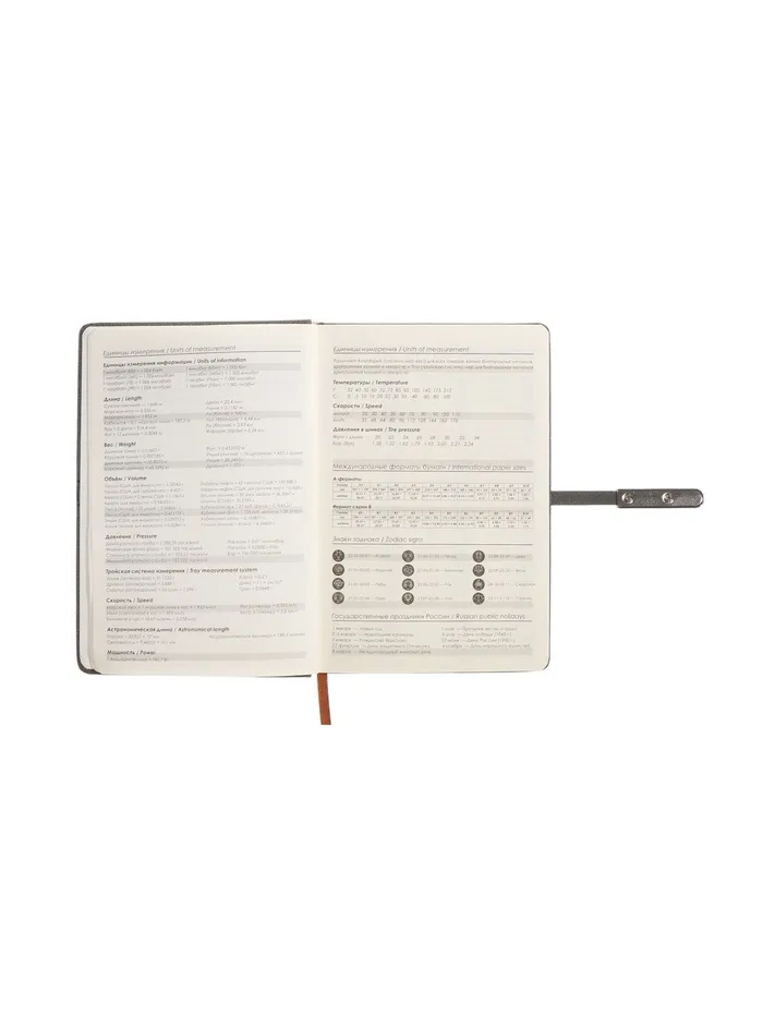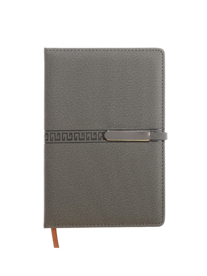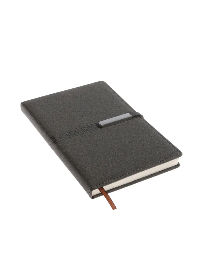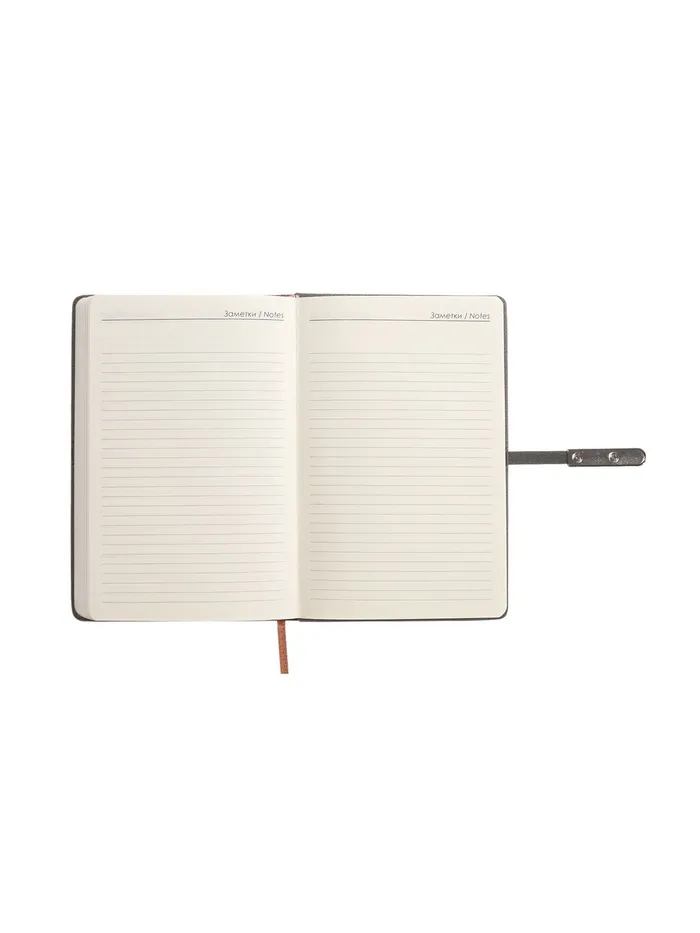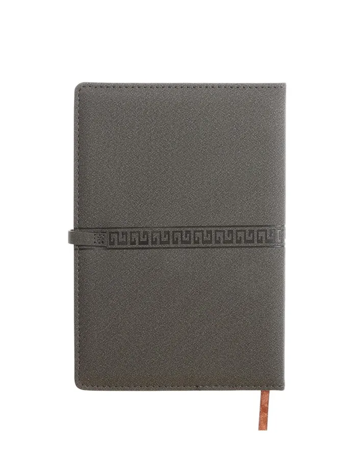 - Защита и стиль: Обложка из ПВХ с серым узором и хлястик надежно сохраняют содержимое и придают ежедневнику строгий внешний вид.