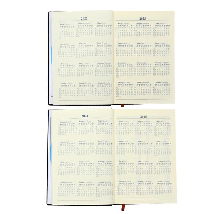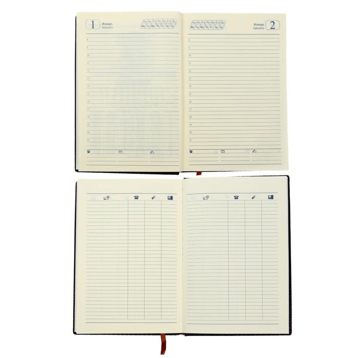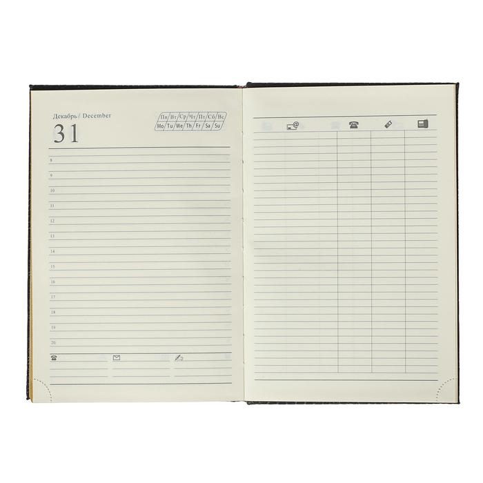 Внутренний блок включает 192 листов тонированной бумаги плотностью 70 г/м2.Каждая страничка имеет перфорированный угол.Благодаря стандартному формату А5 ежедневник удобно использовать как в офисе, так и на выездных деловых встречах.Твердая обложка, стилизованная под кожу, подходит для горячего тиснения.Дополнением является закладка - ляссе, с помощью которой при необходимости можно быстро открыть ежедневник на нужной странице.Помимо прочего ежедневник снабжен обширным справочным материалом.Ежедневник станет отличным подарком к любому празднику и событию.Стиль и изысканность, роскошь и практичность, совершенство снаружи и внутри - всем этим требованиям достойно отвечает продукция.