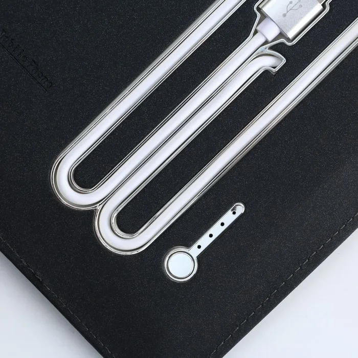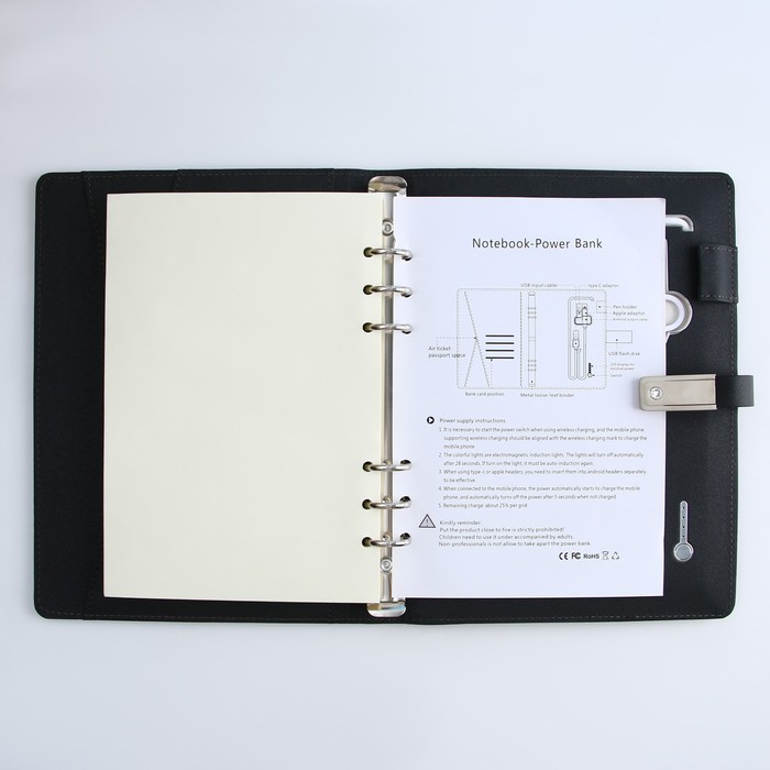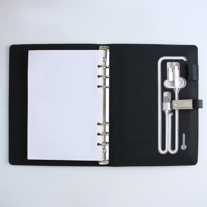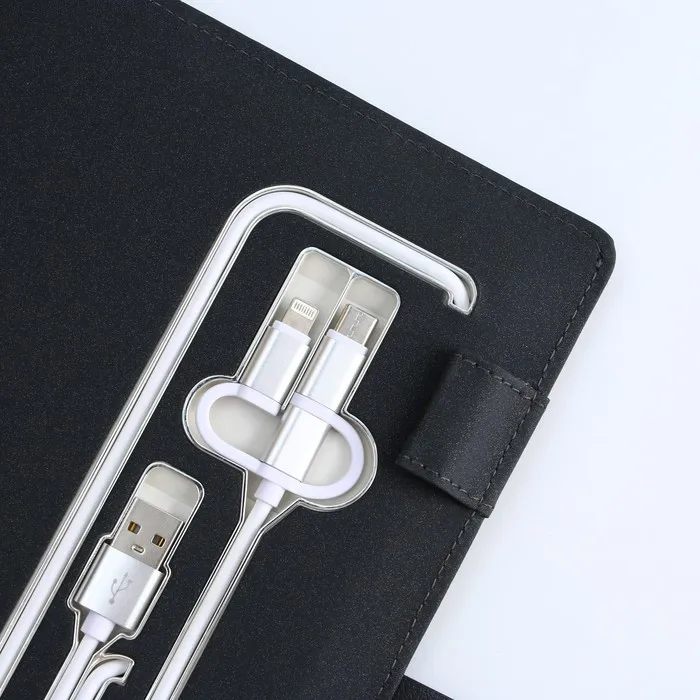 Набор состоит из блока листов для записей в количестве 80 листов: их вы со временем можете заменить на новый блок. Также в этом ежедневнике предусмотрен внешний аккумулятор на 8000 mAh, изящно скрытый на задней обложке. Зарядное устройство дополнено переходником, проводами с разъемами USB, micro-USB, Type-C и Lightning и кнопкой включения-выключения, расположенной рядом. Кроме этого внутри на обложке есть место под карандаш, кармашки для банковских карт и билетов.