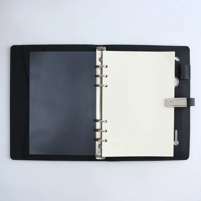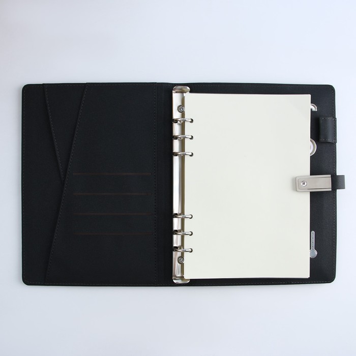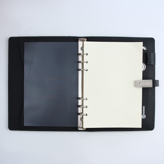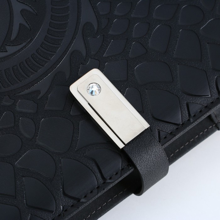 Закрывается ежедневник на магнитную ленту-застёжку, на которой помещается флеш-карта на 16 Гб.