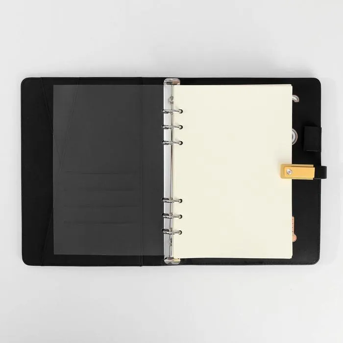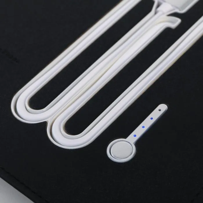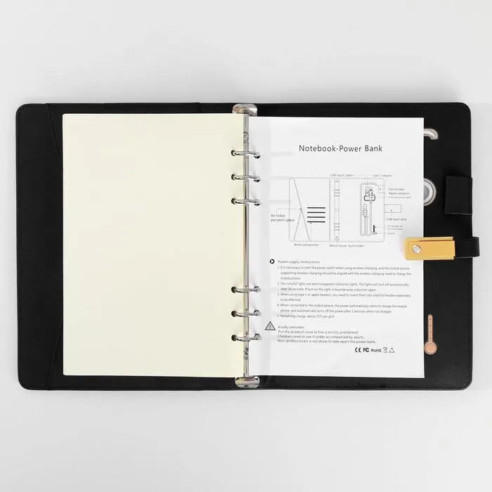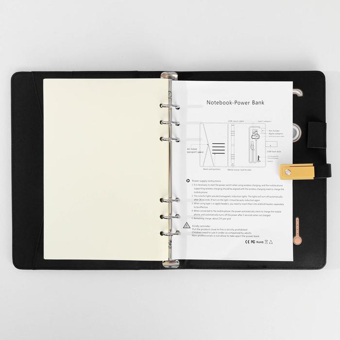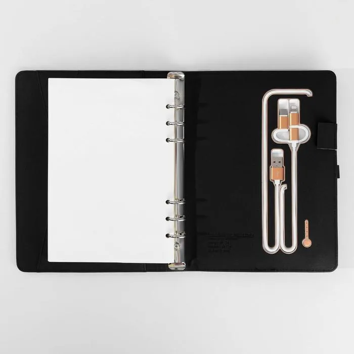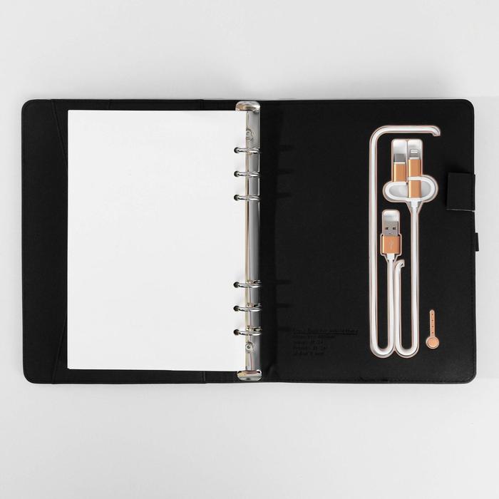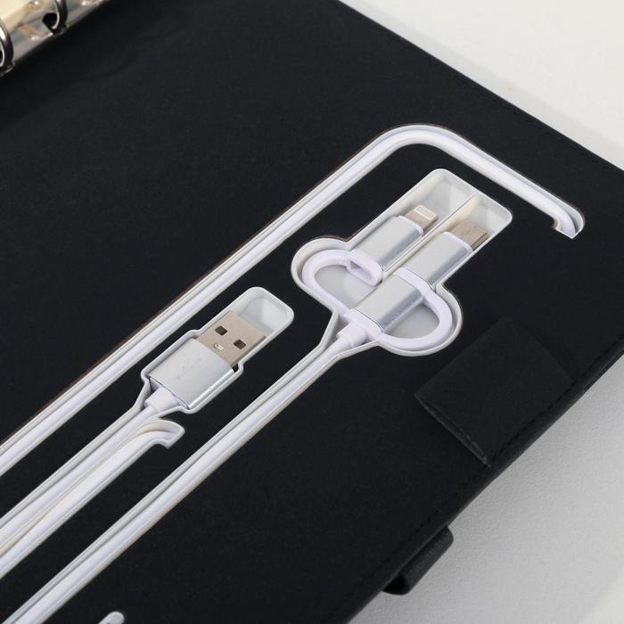 Набор состоит из блока листов для записей в количестве 80 листов: их вы со временем можете заменить на новый блок. Также в этом ежедневнике предусмотрен внешний аккумулятор на 8000 mAh, изящно скрытый на задней обложке. Зарядное устройство дополнено переходником, проводами с разъемами USB, micro-USB, Type-C и Lightning и кнопкой включения-выключения, расположенной рядом. Кроме этого внутри на обложке есть место под карандаш, кармашки для банковских карт и билетов.