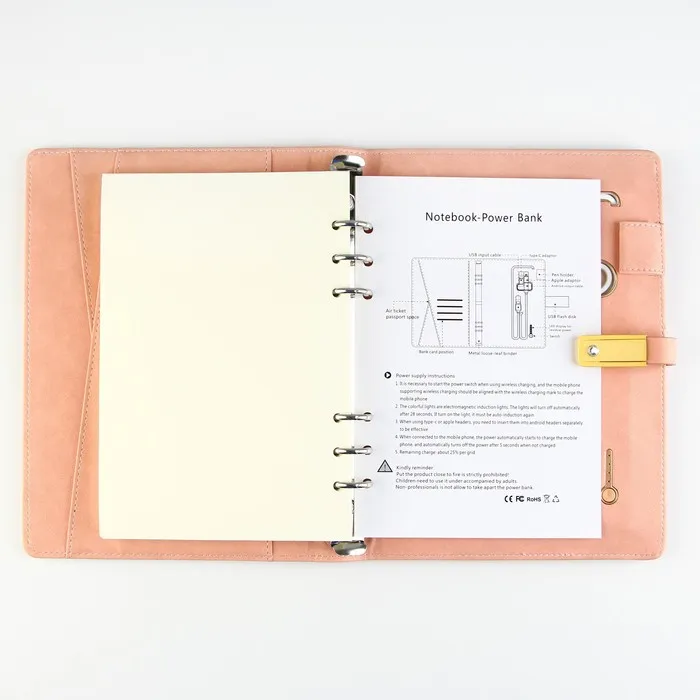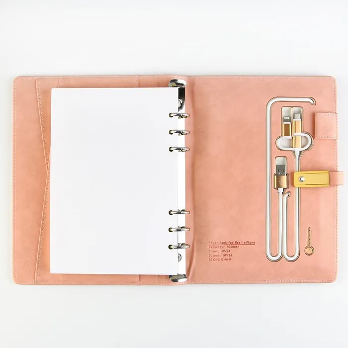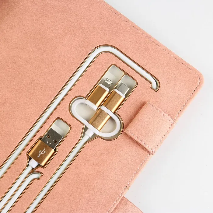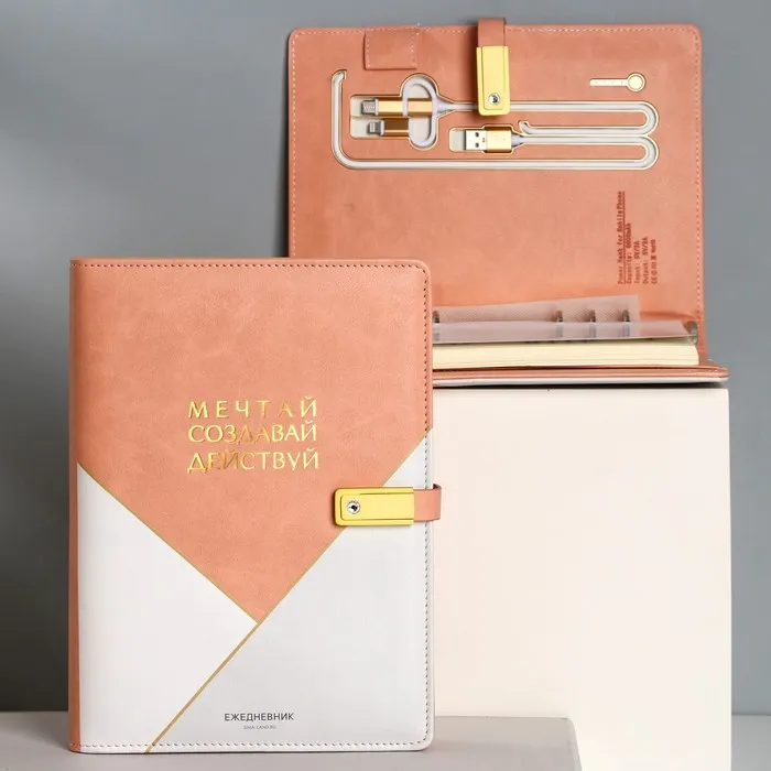 Набор состоит из блока листов для записей в количестве 80 листов: их вы со временем можете заменить на новый блок. Также в этом ежедневнике предусмотрен внешний аккумулятор на 8000 mAh, изящно скрытый на задней обложке. Зарядное устройство дополнено переходником, проводами с разъемами USB, micro-USB, Type-C и Lightning и кнопкой включения-выключения, расположенной рядом. Кроме этого внутри на обложке есть место под карандаш, кармашки для банковских карт и билетов.