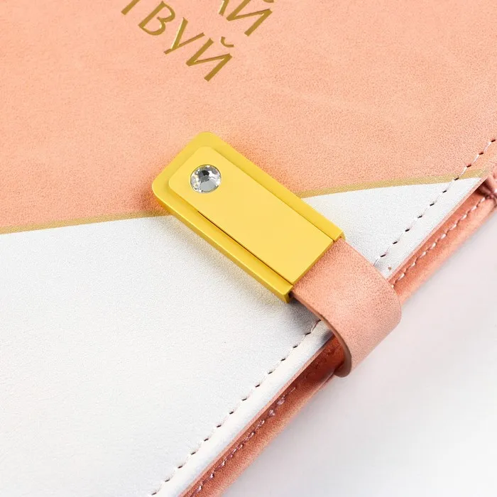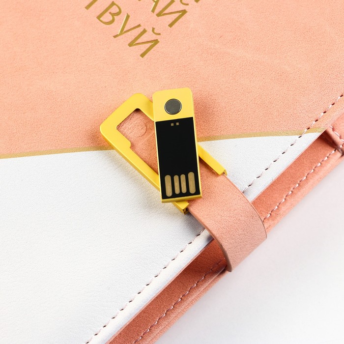 Закрывается ежедневник на магнитную ленту-застёжку, на которой помещается флеш-карта на 16 Гб.