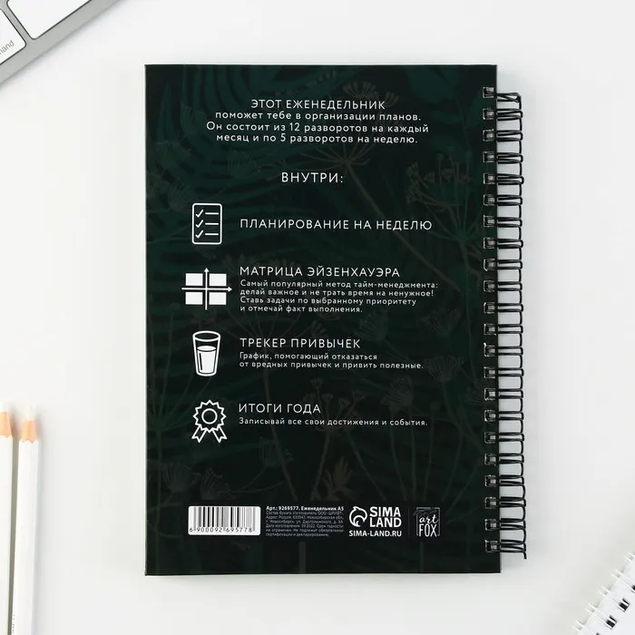 Этот еженедельник поможет тебе в организации планов. Он состоит из 12 разворотов на каждый месяц и 5 разворотов на неделю.