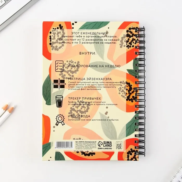 Этот еженедельник поможет тебе в организации планов. Он состоит из 12 разворотов на каждый месяц и 5 разворотов на неделю.