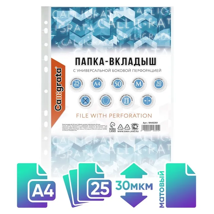 Файл-вкладыш А4 30мкм Calligrata матовый, вертикальный, 25шт — Характеристики
