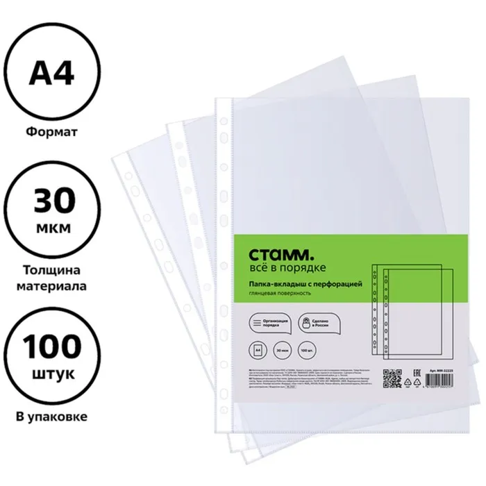 Файл-вкладыш А4, 30мкм, СТАММ, глянцевый, вертикальный, 100 штук — Характеристики
