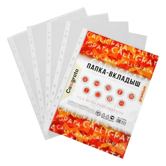 Папка - вкладыш с универсальной перфорацией для хранения неперфорированных документов А4. Толщина пластика 60 мкм, тисненая поверхность, высокая прозрачность. Логотип на боковой ленте. Упаковка в пакет по 25 шт.