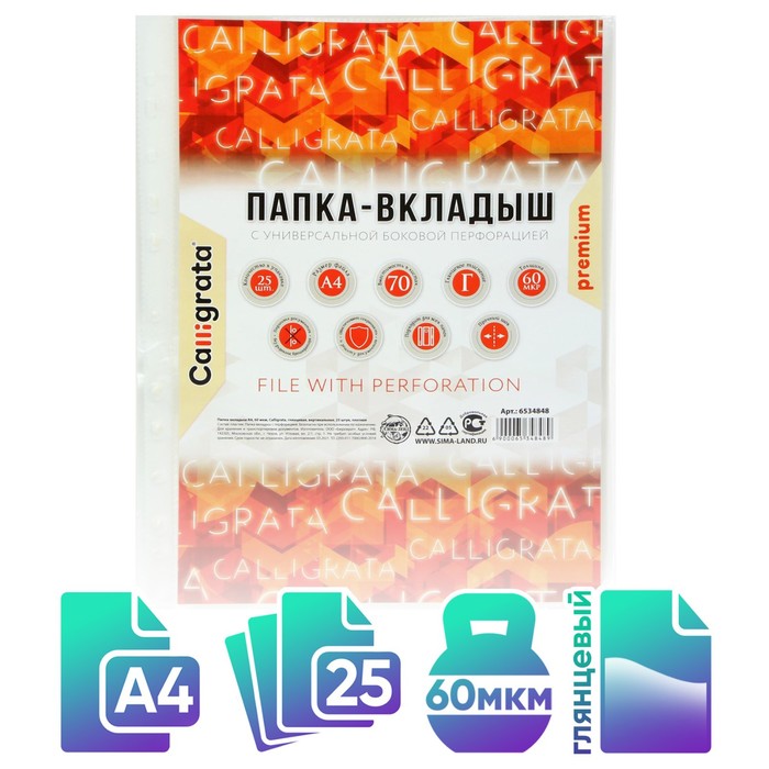 Файл-вкладыш А4, 60 мкм, Calligrata, плотные, глянцевый, вертикальный, 25 штук — Характеристики