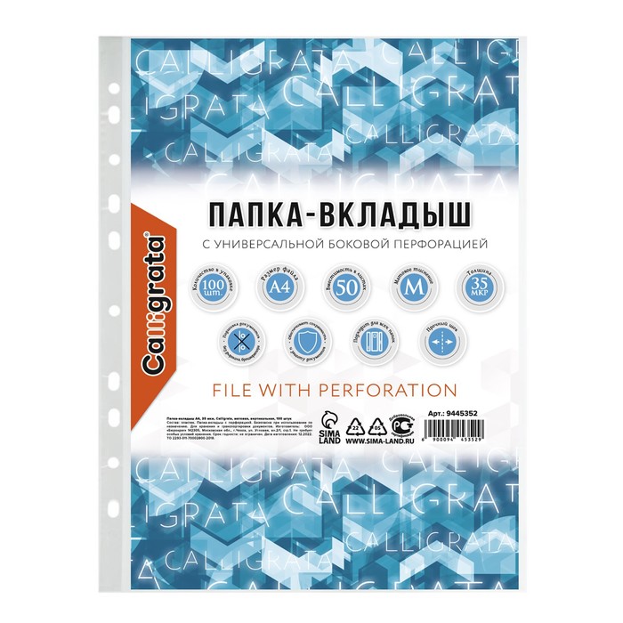 Перфорированные папки-файлы (файлы-вкладыши) Calligrata обеспечивают сохранность бумажных носителей, защищают их от истирания, увлажнения, загрязнения, при этом обладают требуемыми параметрами прочности и прозрачности, позволяют систематизировать все важные документы.