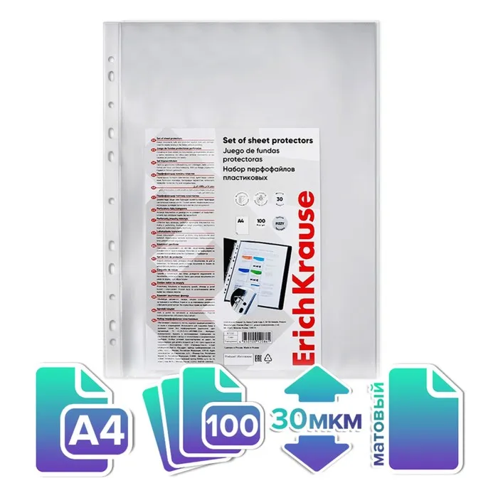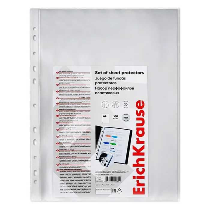 Файл - вкладыш ErichKrause Fizzy Clear, А4, 30 мкм, прозрачный, тиснение «апельсиновая корка», вертикальный, вмещает до 50 листов, 100 штук — Характеристики