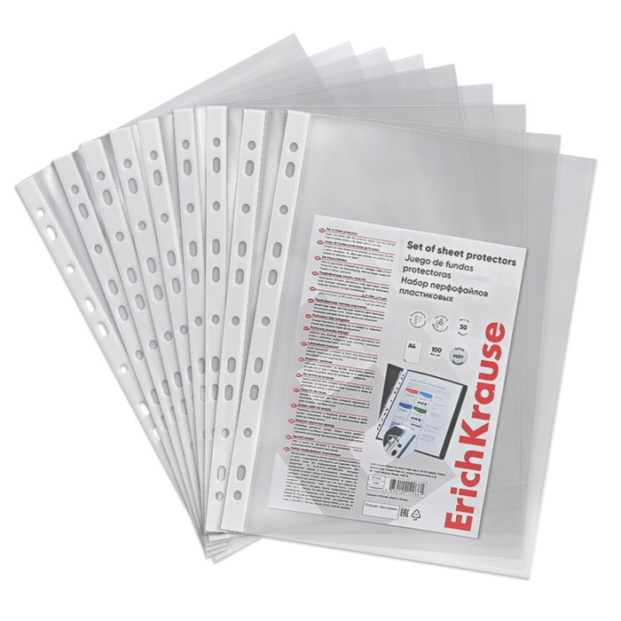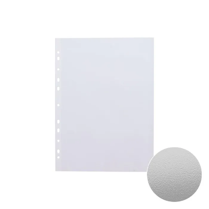 Матовые прозрачные файлы-вкладыши формата А4 из высококачественного прозрачного пластика с текстурой поверхности "апельсиновая корка", на которой не видно отпечатков пальцев и мелких царапин. Предназначен для подшивки бумаг в папки без перфорирования дыроколом. Коллекция: «Clear»