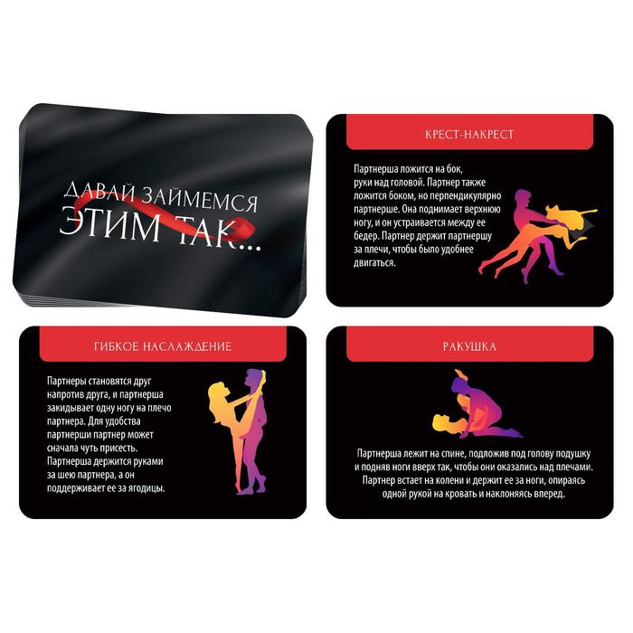 В этой коробке вас ждёт 20 самых возбуждающих эротических поз. Хотите попробовать что-то новое и необычное? Тогда эти фанты — именно то, что вам нужно. Рассматривайте карточки, выбирайте понравившиеся позы и дарите друг другу наслаждение.
