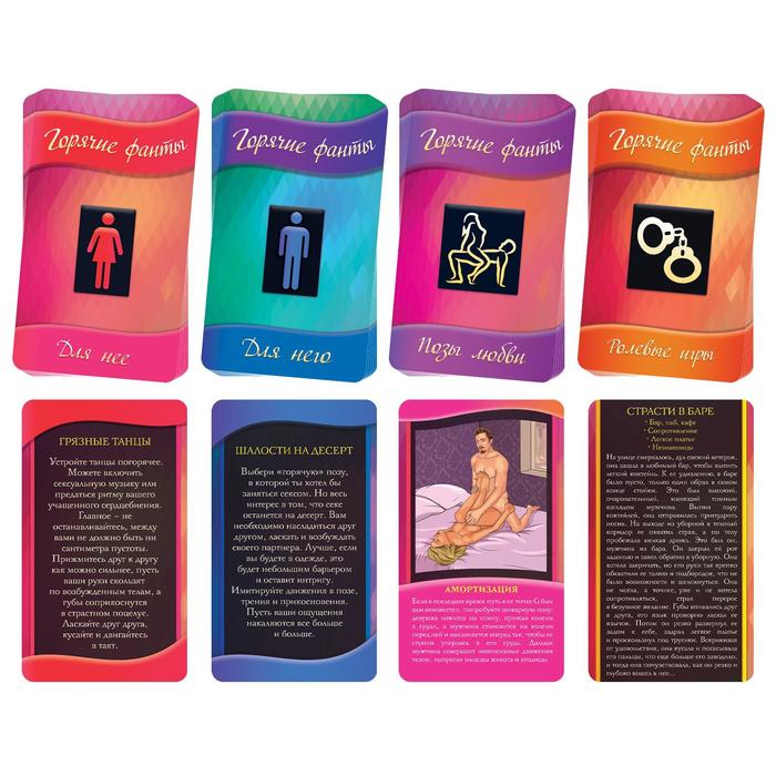 В карточках «Для неё» вы найдёте задания, способные до предела возбудить желание партнера. Колода «Для него» таит в себе секреты наслаждения для партнерши. Карты «Позы любви» — это невероятные описания сексуальных позиций, сопровождающиеся откровенными иллюстрациями. А на сладкое мы приготовили колоду «Ролевые игры» — с ней вы подарите друг другу новые эмоции и ощущения.