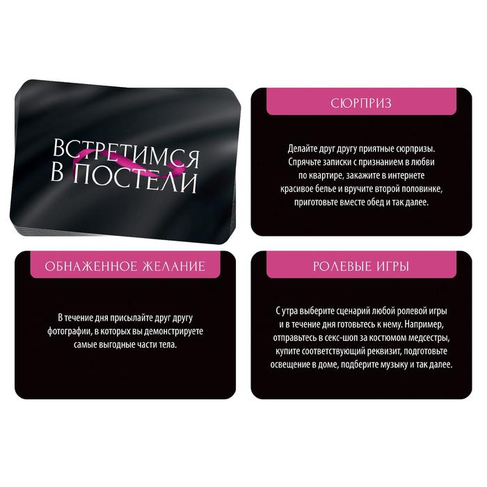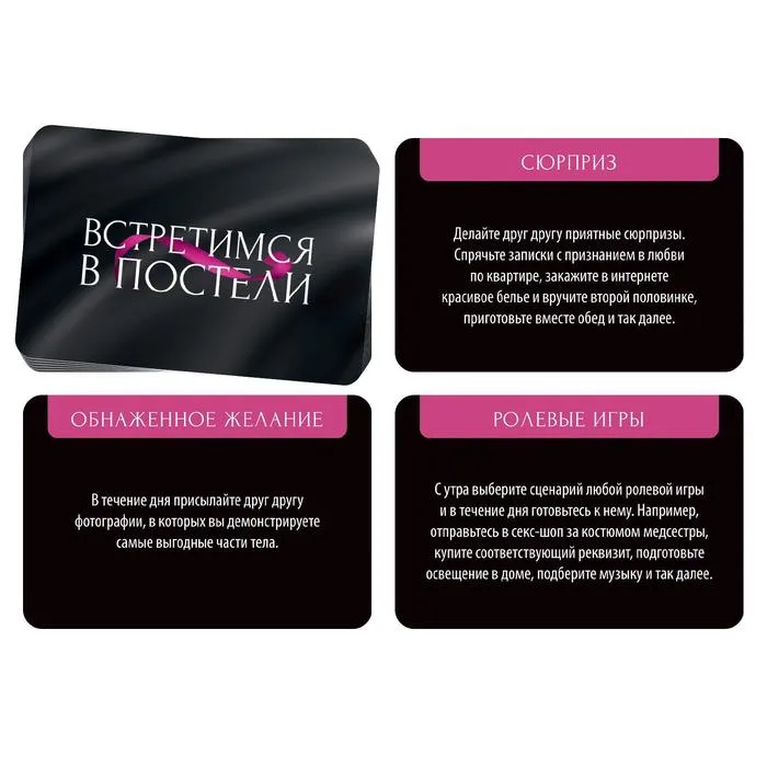 В этой коробке вас ждёт 20 способов возбудить друг друга в течение дня, чтобы вечером оказаться на вершине наслаждения. Для начала изучите задания и выберите те, которые будете использовать сегодня. Вытягивайте карточки, зачитывайте возбуждающие задания и выполняйте их!
