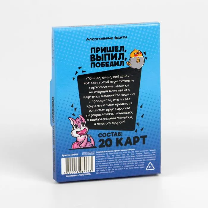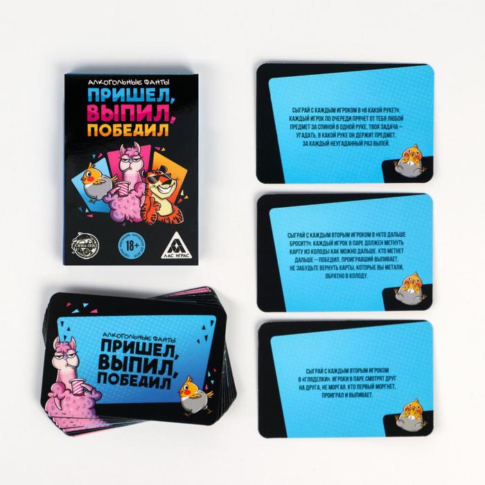 «Пришёл, выпил, победил» – вот девиз этой игры! Готовьте горячительные напитки, по очереди вытягивайте карточки, выполняйте задания и проверяйте, кто из вас круче всех. Вам предстоит сразиться друг с другом в армрестлинге, гляделках, в подбрасывании монетки и многом другом!