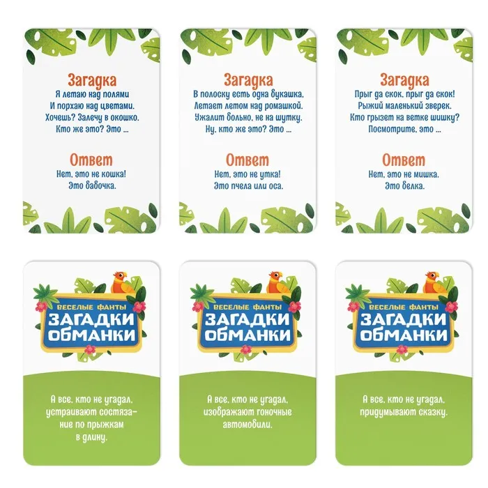 Выберите ведущего, который будет зачитывать загадки с карточек. Задача остальных участников — их отгадывать. Только будьте внимательны: правильный ответ не рифмуется с остальным стишком.