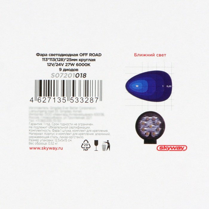 Фара светодиодная Skyway OFF ROAD, круглая, 12/24 В, 27 Вт, 6000 K, 9 диодов, 115 мм — Характеристики