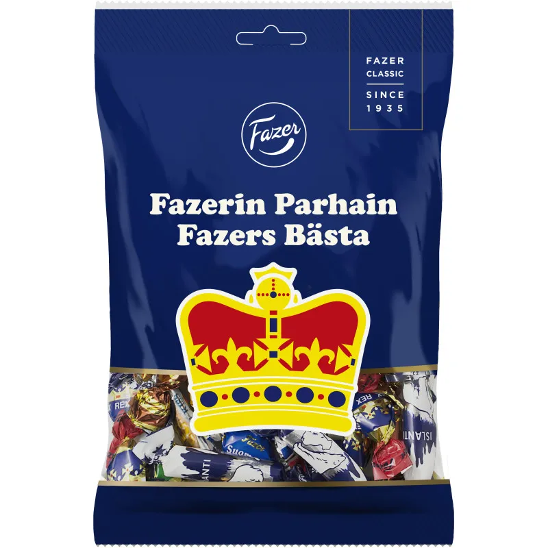 Fazerin Parhain - это мешок с конфетами, который перенесет вас в путешествие по вкусам прошлого. С 1935 года этот набор конфет включает в себя вкусовые воспоминания многих поколений. Откройте для себя свои старые и новые любимые вкусы! В наборе семь различных конфет: Kiss-Kiss, Islanti, Tosca, Lakta, Orange, Suometar и Rex. Упаковка весит 220 г. Мы постоянно обновляем информацию о продукте, однако всегда рекомендуем проверять данные на упаковке.