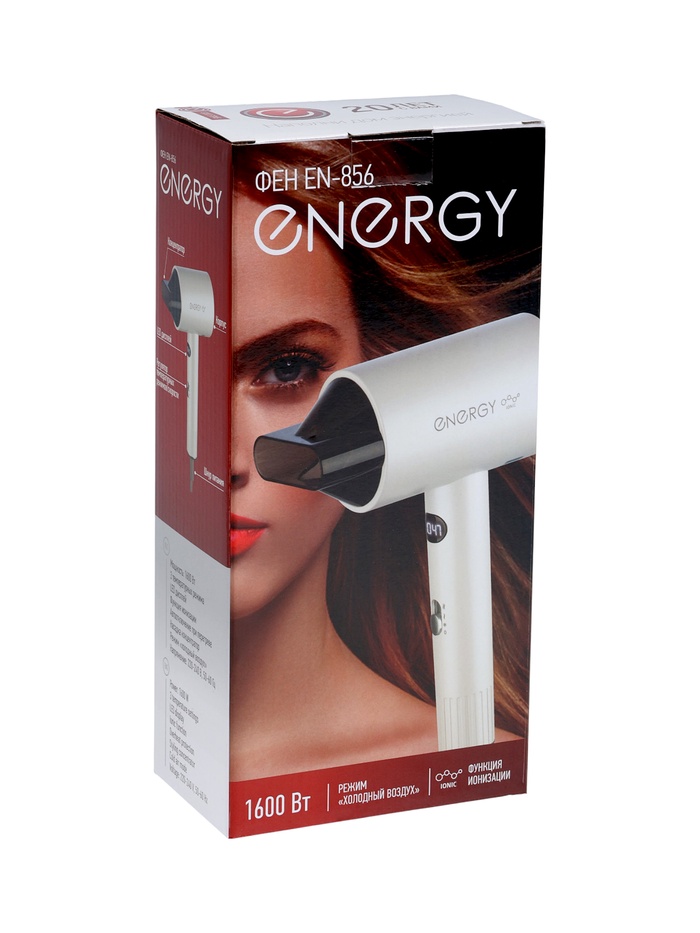 Фен Energy EN-856, 1600 Вт, 2 скорости, 3 температурных режима, ионизация, дисплей, белый — Характеристики