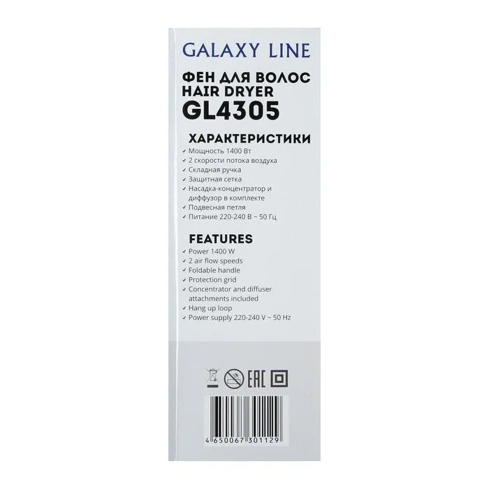 Фен Galaxy GL 4305, 1400 Вт, 2 скорости, 1 температурный режим, серебристый — Характеристики