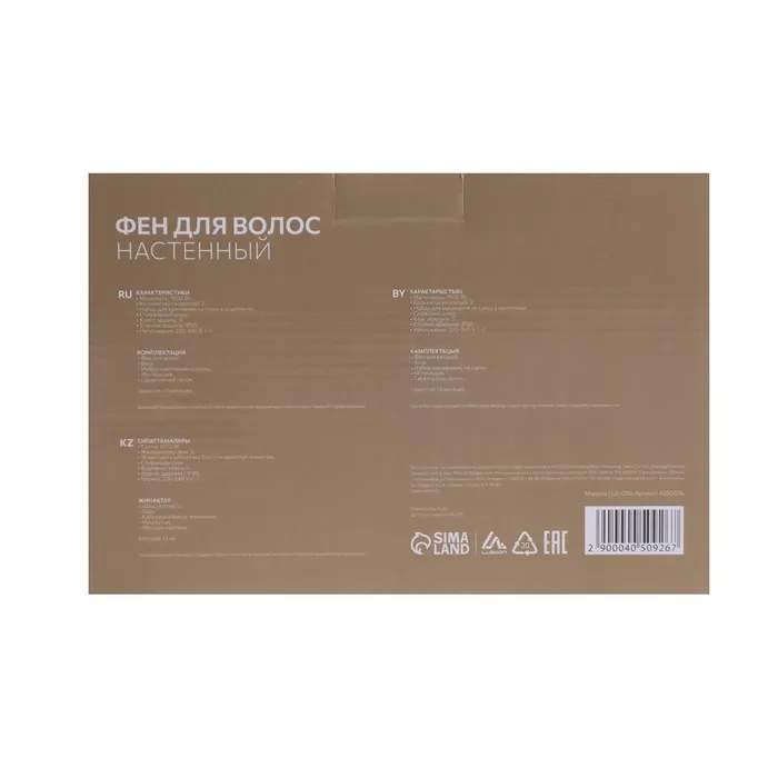 Фен Luazon LGE-006, 1600 Вт, настенный, 2 скорости, набор крепления, белый — Характеристики