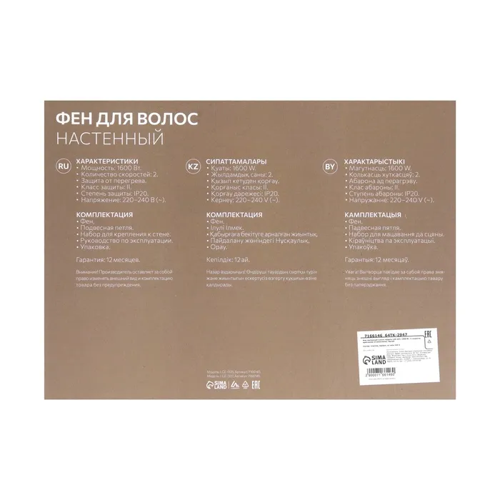 Компактный фен для волос LGE-007 с настенным креплением подойдёт для быстрой домашней укладки. С его помощью вы можете сделать естественную укладку без особых усилий, а оптимальная мощность устройства сократит время процесса.