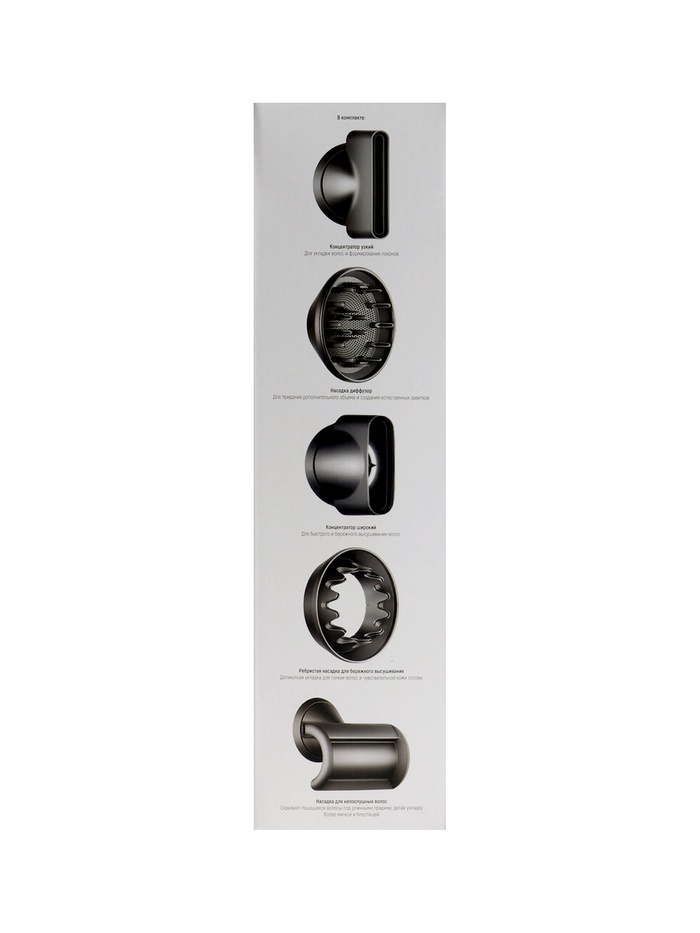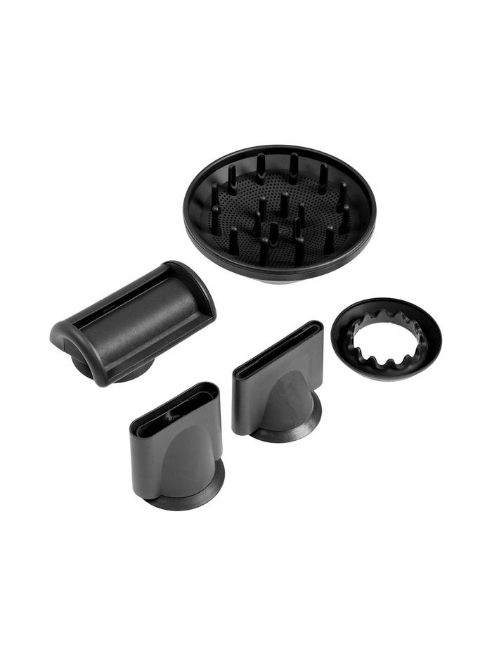 В комплект входят 5 насадок, включая диффузор, что делает фен универсальным инструментом для создания различных причесок. Ионизация помогает уменьшить статическое электричество, придавая волосам гладкость и блеск.