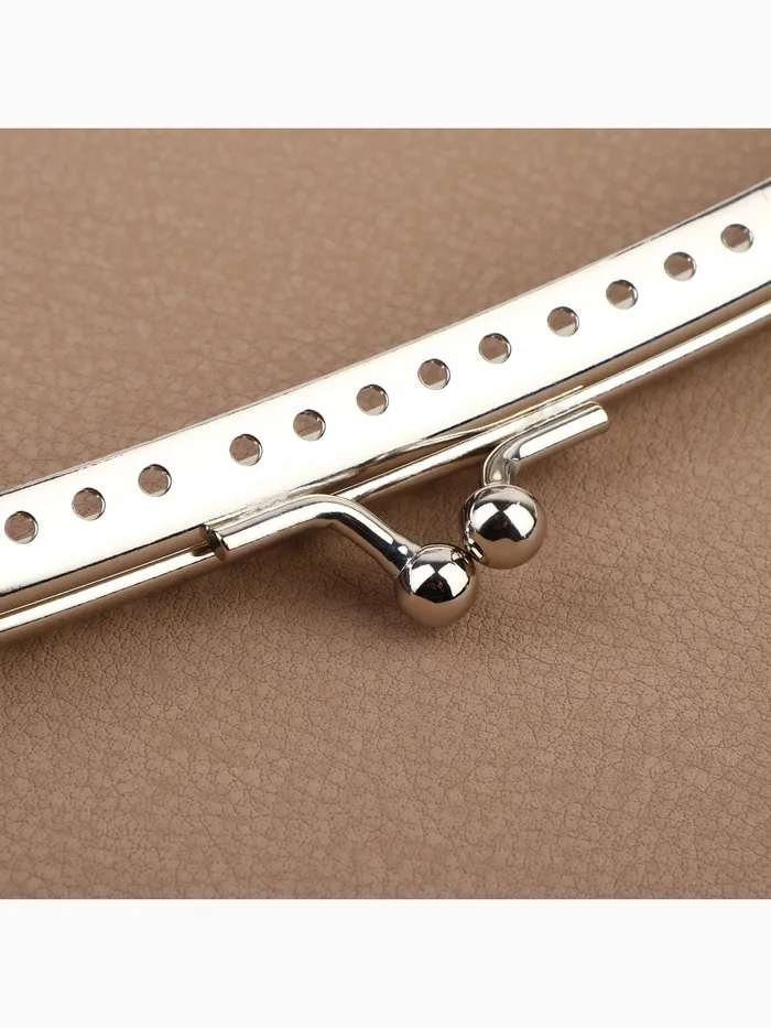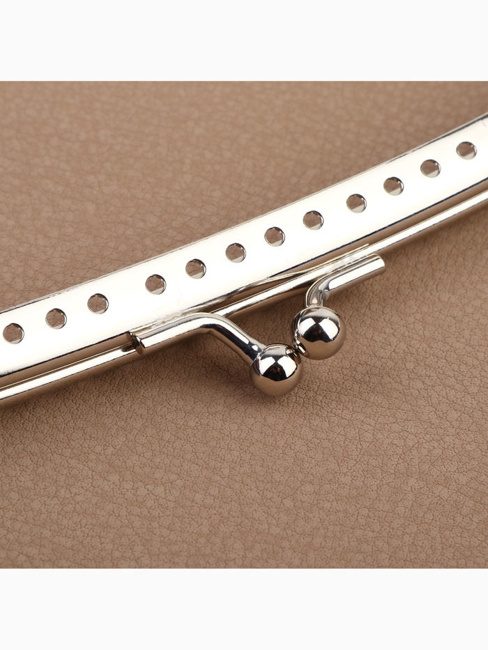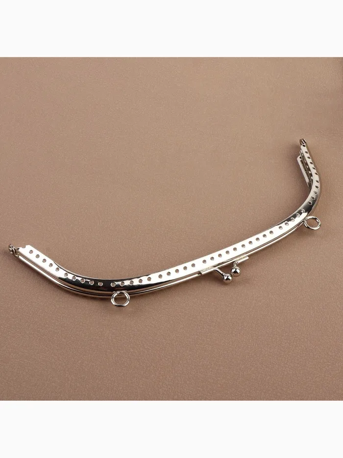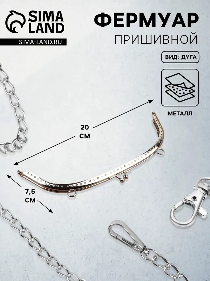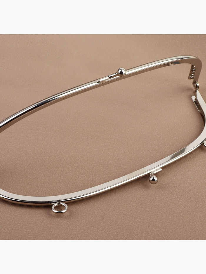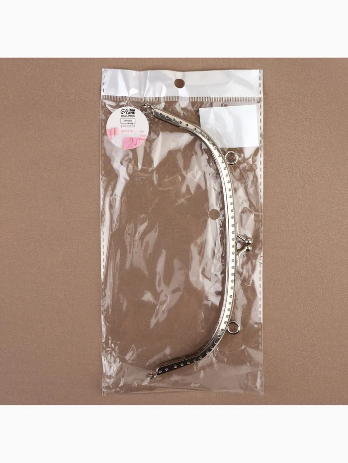 Серебристый фермуар полукруглой формы с креплениями от бренда «Арт Узор» — надежное решение для объемных аксессуаров. Габариты 20×7.5 см создают прочную основу для крупных сумок, дорожных чемоданов и дизайнерских изделий из плотных материалов.