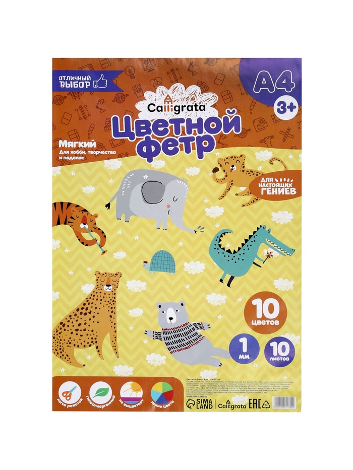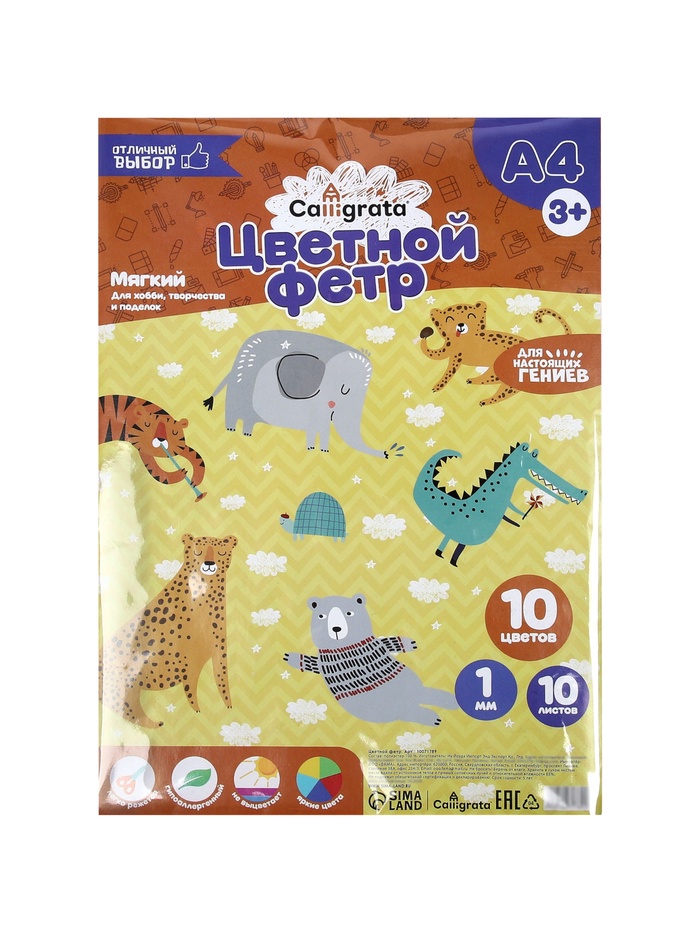 Фетр цветной набор, толщина-1 мм, формат А4, мягкий, 10 листов, 10 цветов, яркие цвета — Характеристики