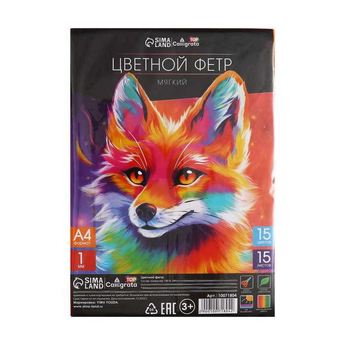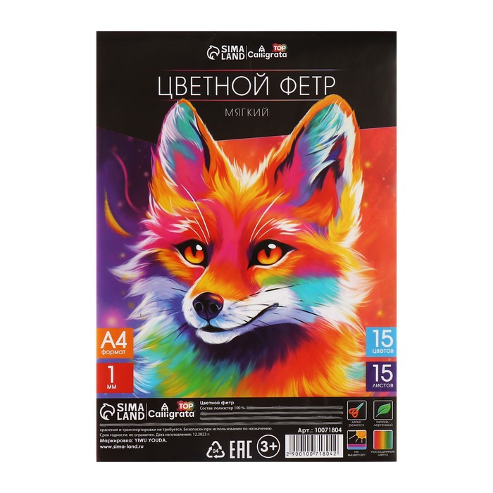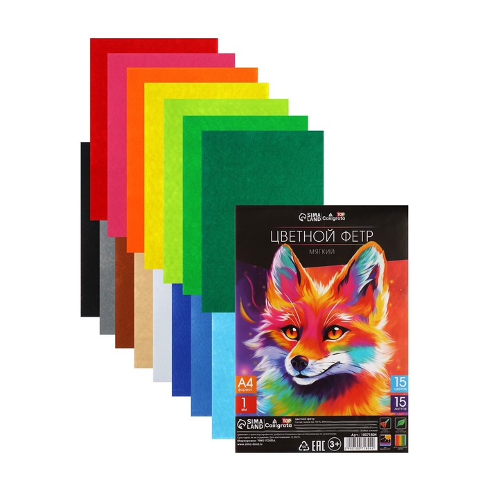 Фетр цветной набор, толщина-1 мм, формат А4, мягкий, 15 листов, 15 цветов, TOP — Характеристики