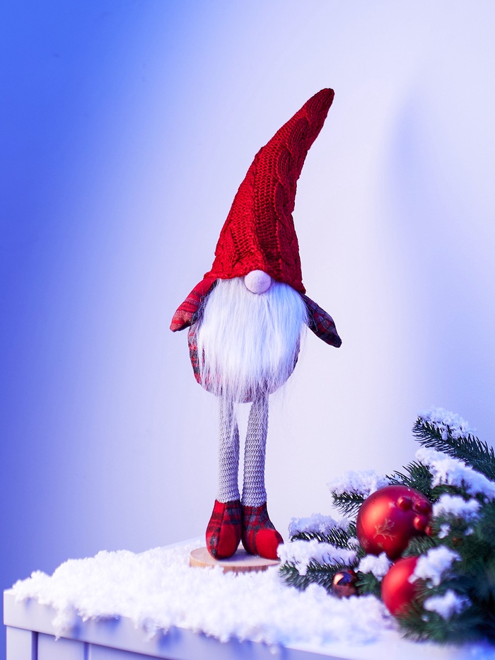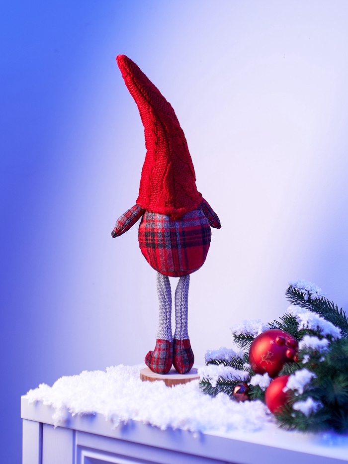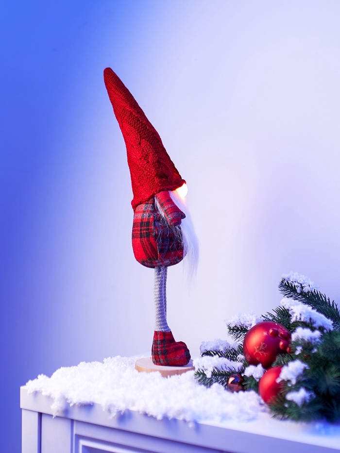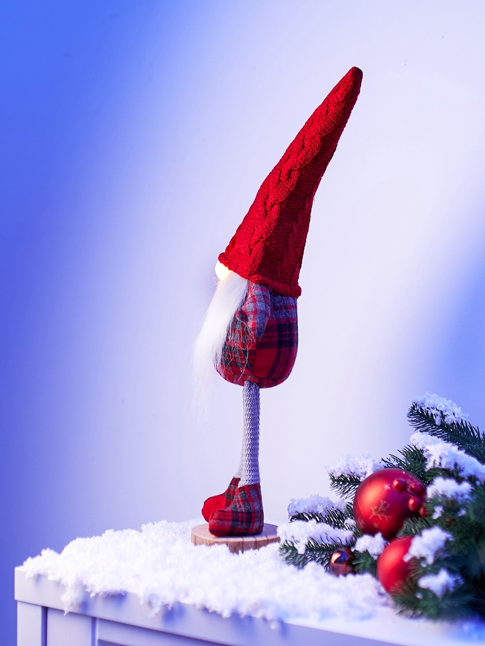 Декоративная фигура в образе гнома в красном костюме добавит в ваш интерьер атмосферу тепла и уюта. Она станет выразительным акцентом в гостиной, спальне или праздничной композиции. Мягкий текстильный материал и тёплое белое свечение создают ощущение домашнего комфорта, а питание от батареек позволяет разместить украшение где угодно — без проводов и розеток.
