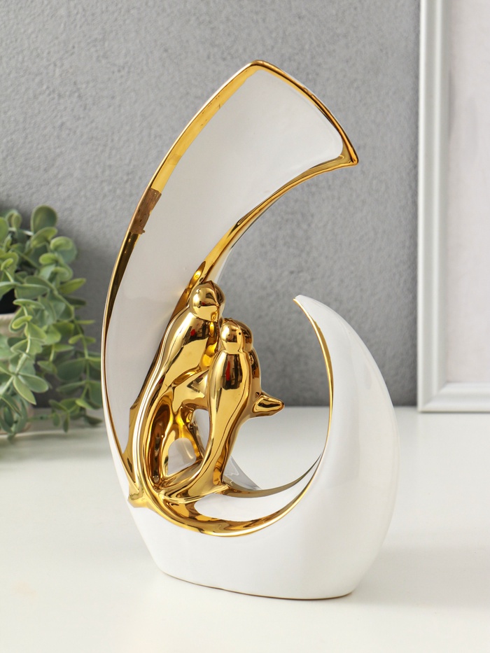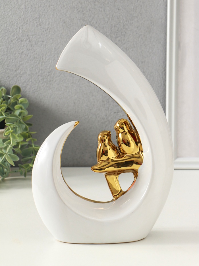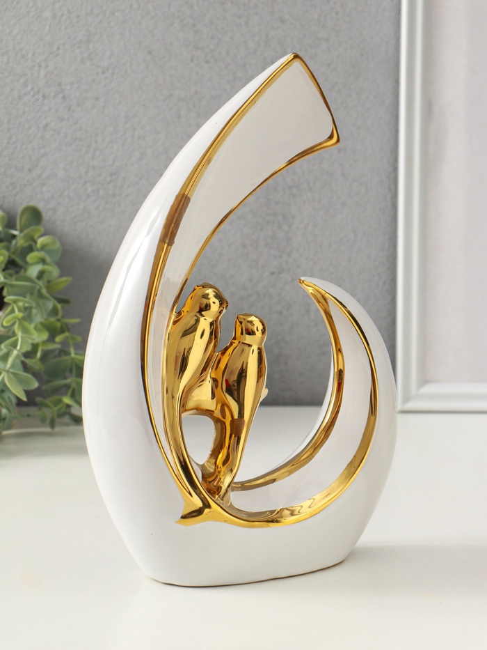 Эта белая керамическая скульптура с золотым покрытием станет изысканным акцентом в вашем интерьере. Абстрактная форма двух птиц передаёт чувство нежности и единства, создавая атмосферу гармонии и спокойствия в доме.