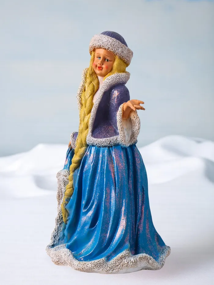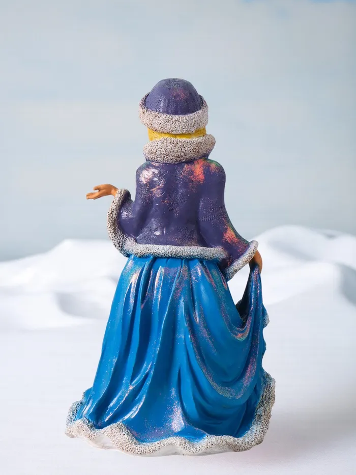 Её нежно-голубой наряд с мерцающим глиттером словно отражает зимнюю морозную свежесть, добавляя праздничный блеск и изящество. Такая фигурка станет не только декоративным элементом, но и символом тепла и сказочного настроения, способствуя созданию уюта и радостного предвкушения Нового года.