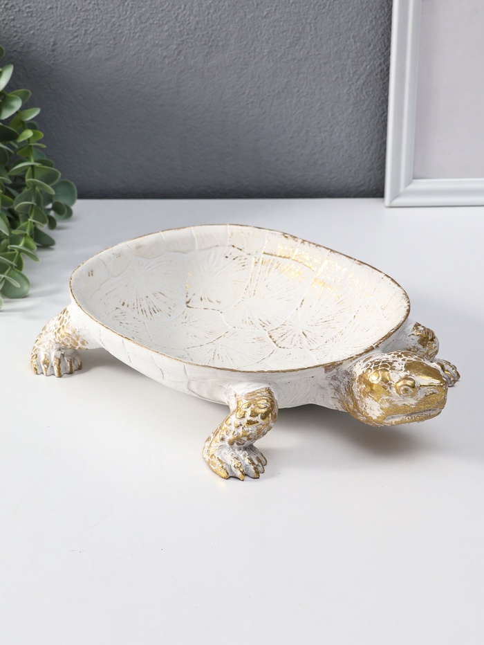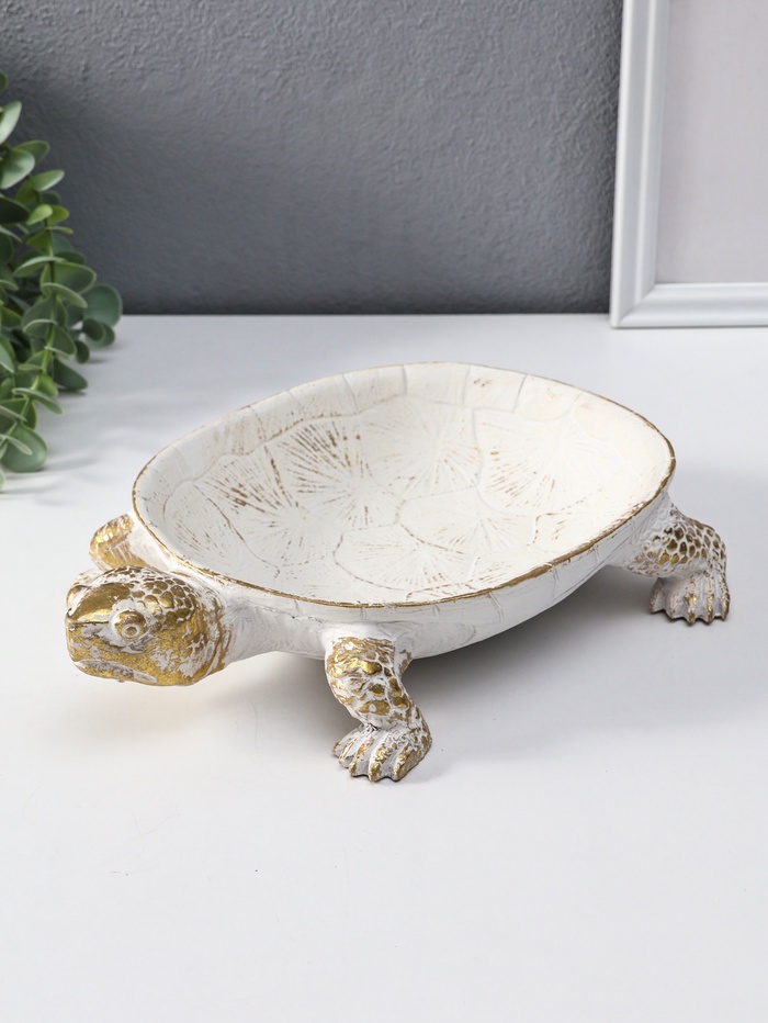Эта элегантная черепаха из полистоуна станет вашим верным помощником в порядке. Она бережно соберёт на своём панцире ключи, украшения или мелочь, превратив обычный стол в стильный и организованный уголок. Универсальный дизайн с позолотой на белом фоне впишется в любой интерьер — от классики до современного минимализма.