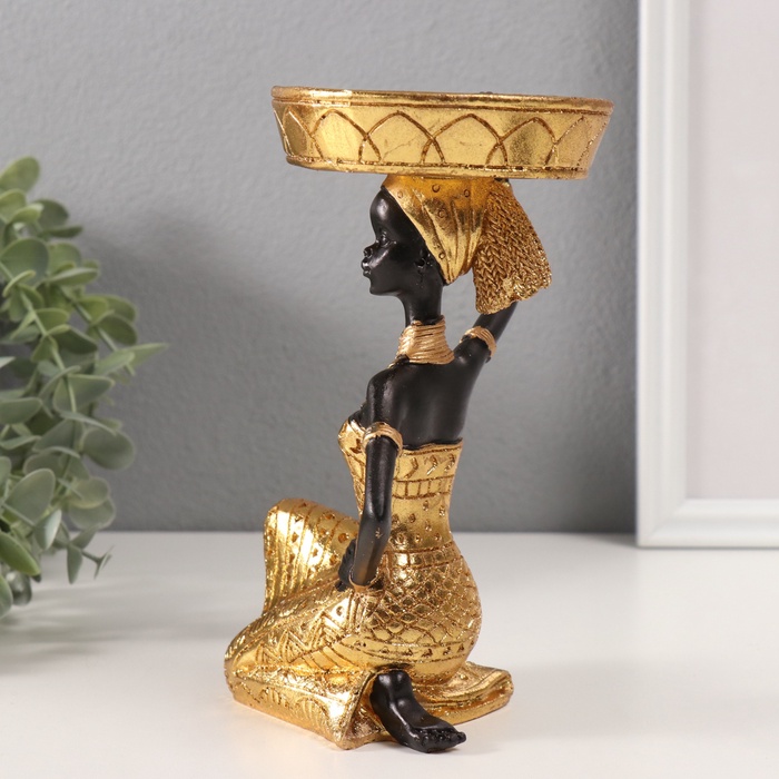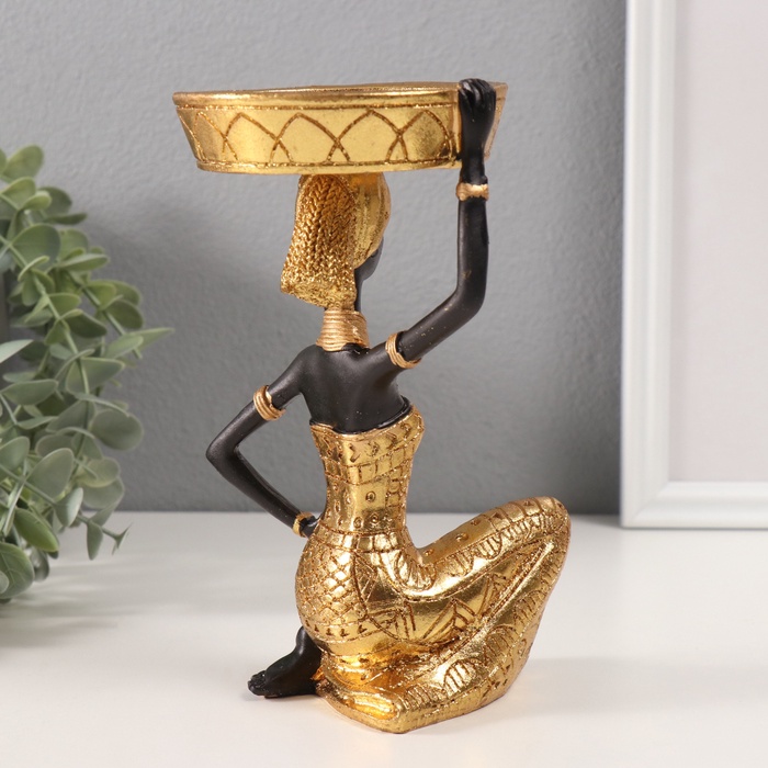Эта фигурка-подсвечник — не просто предмет интерьера, а настоящая история, воплощённая в полистоуне. Яркая африканка с большим тазиком на голове, выполненная в золотистых тонах, привносит в пространство нотки экзотики и уюта. Её грациозная форма и тщательно проработанные детали — от складок одежды до выразительного лица — делают каждую фигурку уникальной, как если бы её создал мастер-ремесленник.