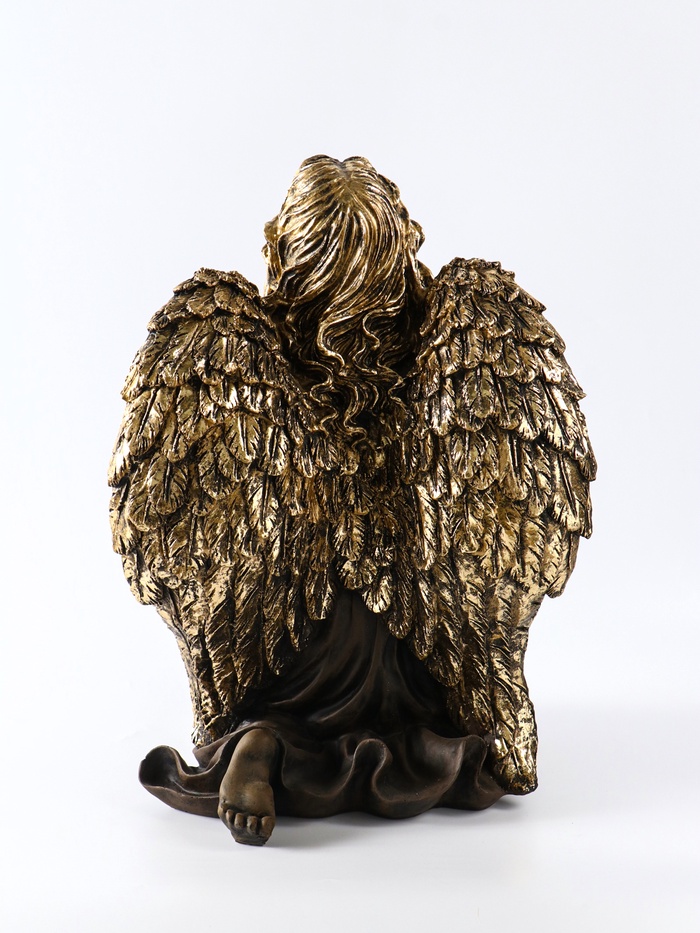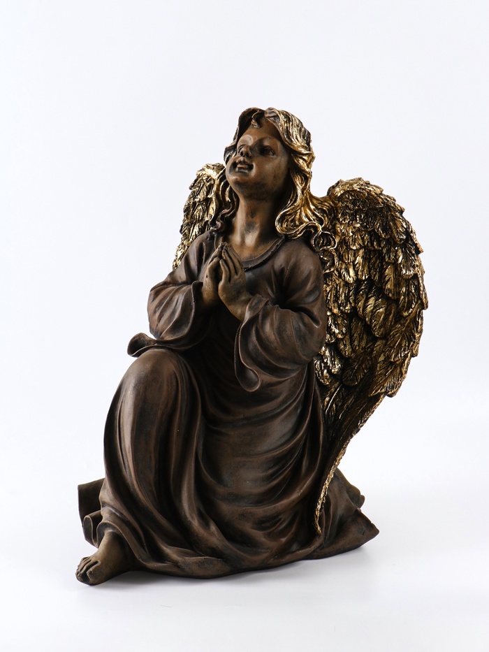 Эта скульптура ангела, сидящего на колене, привносит в пространство ощущение спокойствия и благоговения. Лаконичная форма и сдержанный бронзовый оттенок создают вневременной образ, который станет смысловым центром вашего интерьера. Изделие передаёт момент тихого размышления, наполняя комнату особой атмосферой.