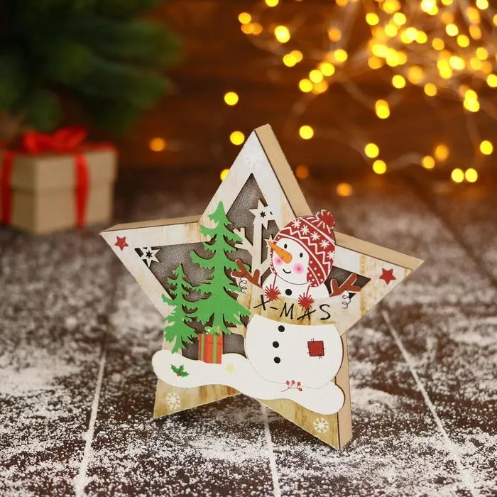 Светильник новогодний «Снеговик в лесу с подарками, в звезде» 16.5×16 см