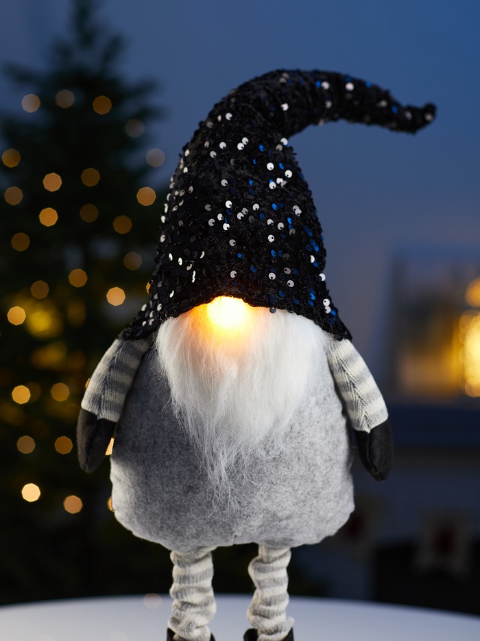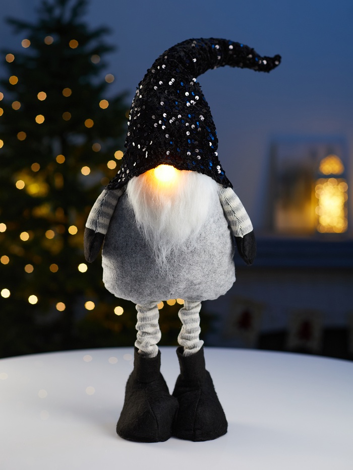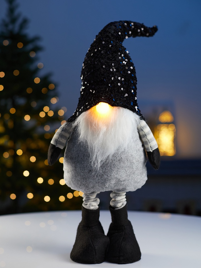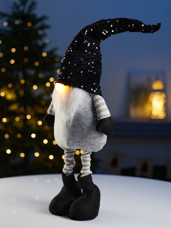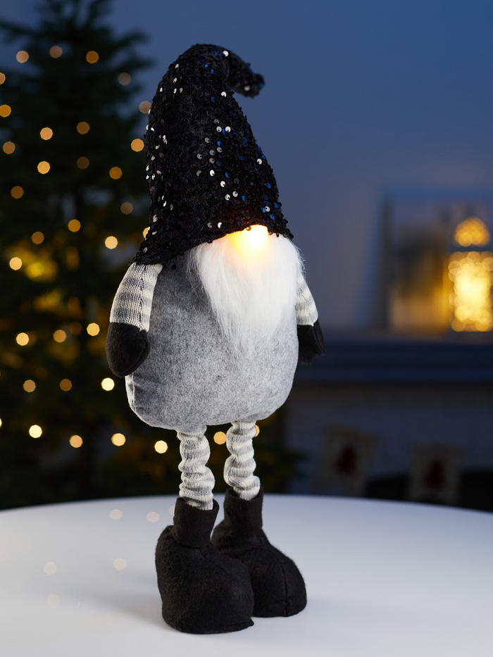 Текстильная фигура в образе гнома, облачённого в элегантный чёрный наряд, создаст атмосферу загадочности и уюта в вашем доме. Высота регулируется от 50 до 70 см благодаря телескопическим ножкам, что позволяет легко адаптировать её под любой интерьер и пространство. Светодиод излучает тёплый белый свет, который мягко освещает помещение, даря комфорт и праздничное настроение.