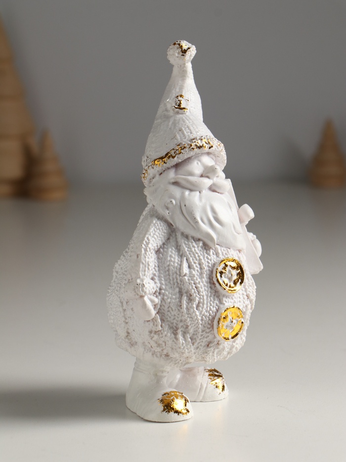Эта фигурка Деда Мороза станет изысканным дополнением новогоднего декора. Изготовленная из литьевого мрамора, она передаёт тонкие детали традиционного костюма, а классическое бело-золотое сочетание создаёт атмосферу торжества и волшебства.