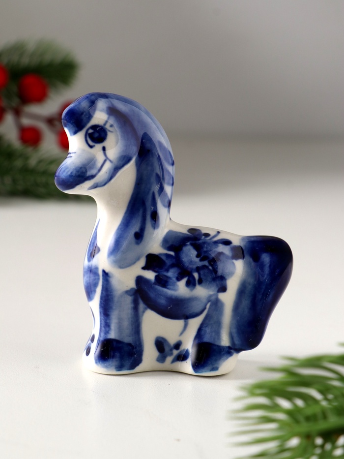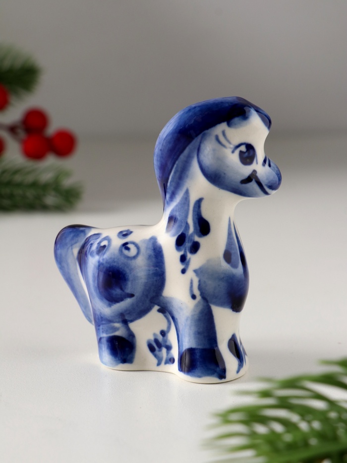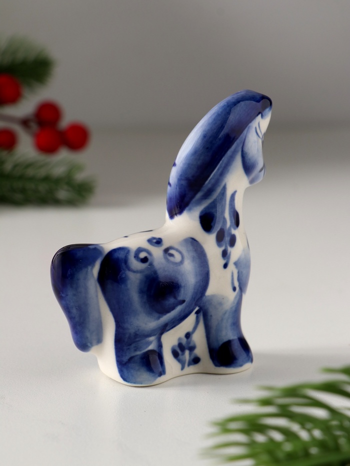 Погрузитесь в мир русской культуры и народного искусства с изысканной фигуркой коня с гривой, выполненной в знаменитой технике гжель. Этот фарфоровый шедевр размером 8×7,5 см воплощает в себе силу, свободу и элегантность. Белоснежный фон с тончайшими узорами в синей палитре создает неповторимую атмосферу классической русской эстетики, которая станет достойным украшением любого интерьера.