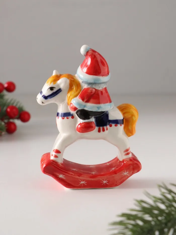 Высотой всего 11 сантиметров, эта качалка привлекает внимание своей яркой расцветкой и детализированной проработкой. Каждый элемент, от узоров на костюме Деда Мороза до причудливых завитков гривы единорога, выполнен с особой тщательностью. Фарфоровая основа гарантирует долговечность и сохранность ярких красок даже спустя годы.