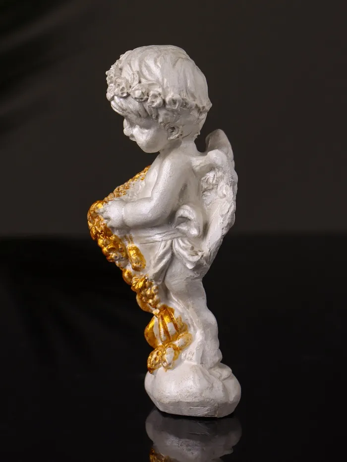Откройте двери в мир изобилия и гармонии с фигуркой, которая станет ярким акцентом вашего интерьера. Эта миниатюрная статуэтка ангела с рогом изобилия, выполненная из гипса и украшенная перламутровым покрытием, имеет высоту 8.5 см и ширину 3 см, что делает её идеальным дополнением для любого пространства.