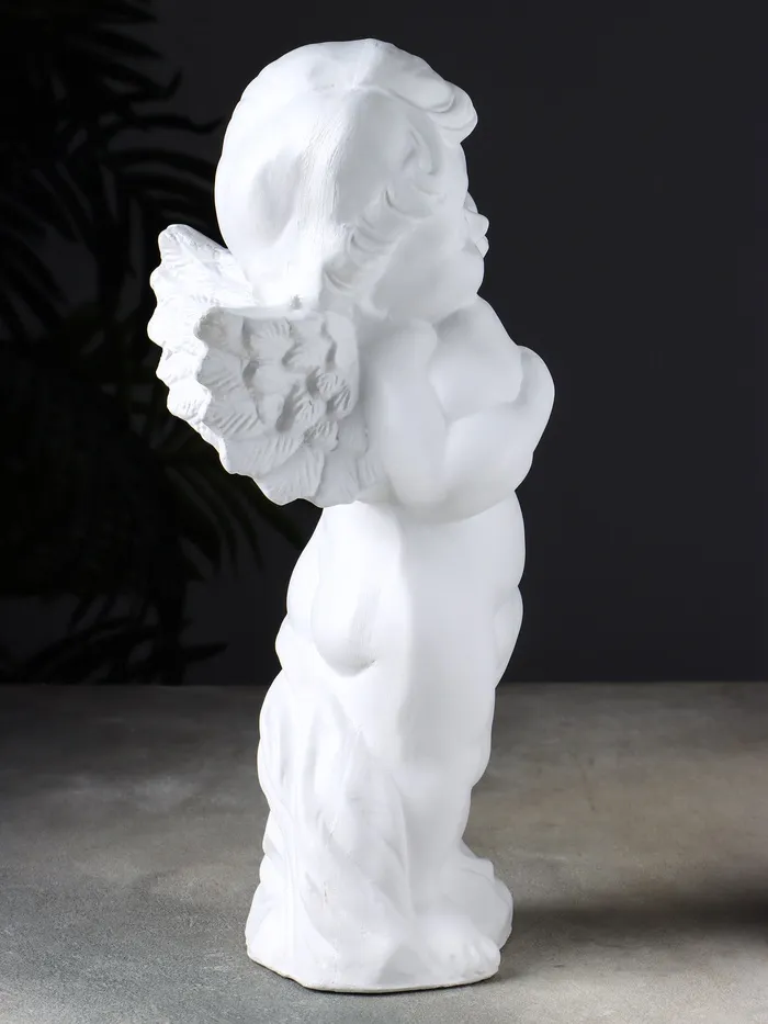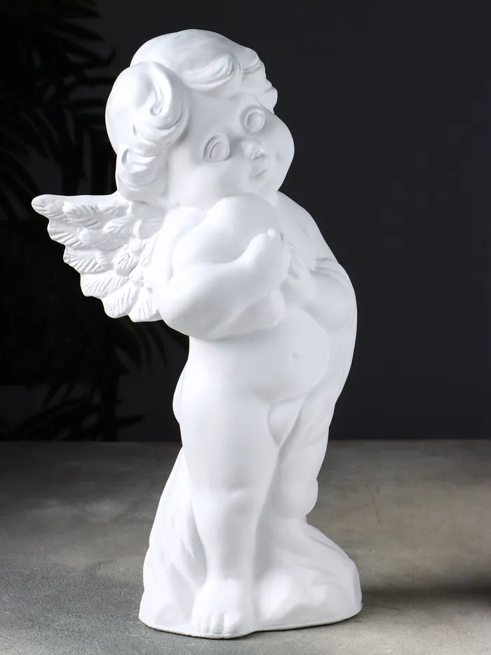 Скульптура отличается точностью проработки деталей: мягкие линии крыльев, поза с опущенными глазами и аккуратно переданная форма сердца создают ощущение внутреннего покоя и светлого настроя. Благодаря универсальной цветовой гамме и форме, изделие легко вписывается в разные интерьерные стили — от классического до современного скандинавского дизайна. Оно одинаково уместно как в роли подарка ко Дню святого Валентина, так и как элемент повседневного декора.