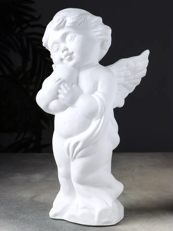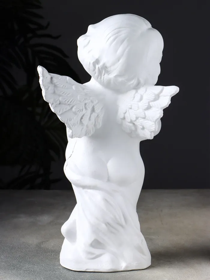 Фигурка ангела, держащего сердце в руках, воплощает нежность, любовь и заботу. Изделие выполнено из прочного гипса и покрыто равномерным белым слоем краски, что подчёркивает чистоту образа и эмоциональную глубину сюжета. Размеры 20×15×35 см делают его удобным для размещения на полке, каминной доске или прикроватной тумбе — без потери художественной выразительности.